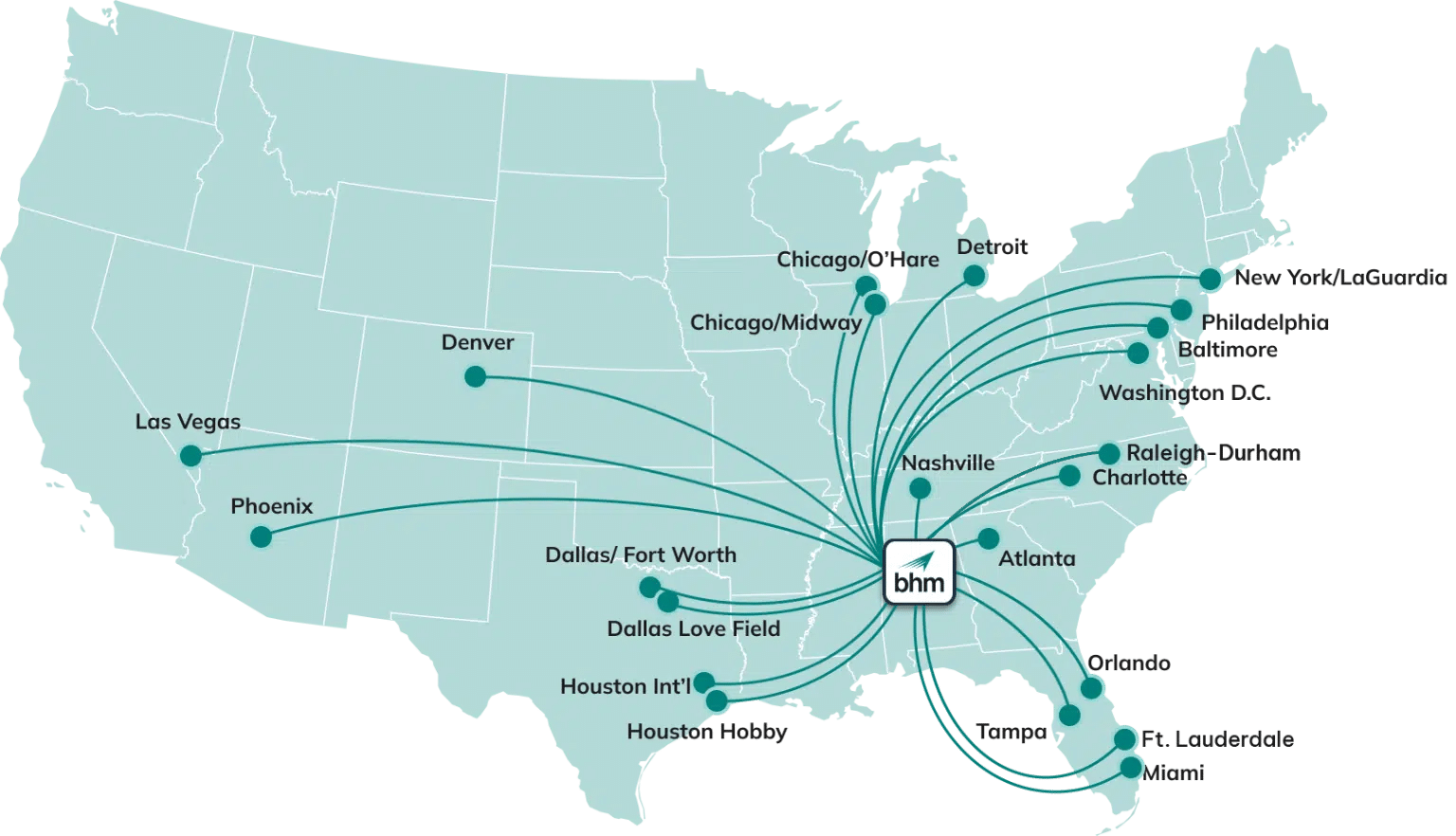 From New York to Las Vegas and a wealth of cities in between, BHM connects you with our top destinations. Home to nonstop flights on American, Delta, Southwest, and United, BHM gets you there faster. And starting July 2026, Breeze Airways will join our growing network of airlines, bringing even more nonstop options to your favorite destinations. Explore 22 airport destinations in 19 cities with nonstop service from Birmingham. Book your next journey today!